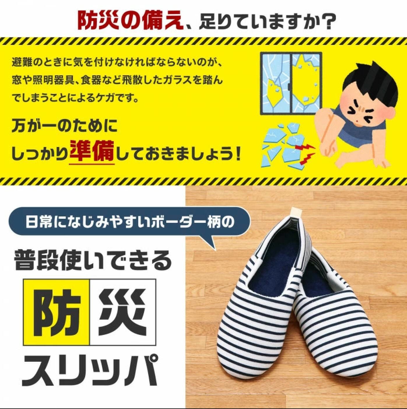 災害時はかかとを上げることで割れ物から足を守ることができる2WAYタイプのスリッパです。